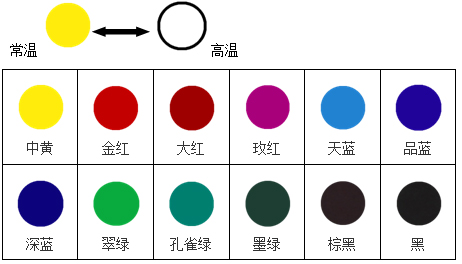 3.可逆溫變變色油墨(原有顏色受熱后變?yōu)榱硪环N顏色,降溫后恢復(fù)原有顏色)
